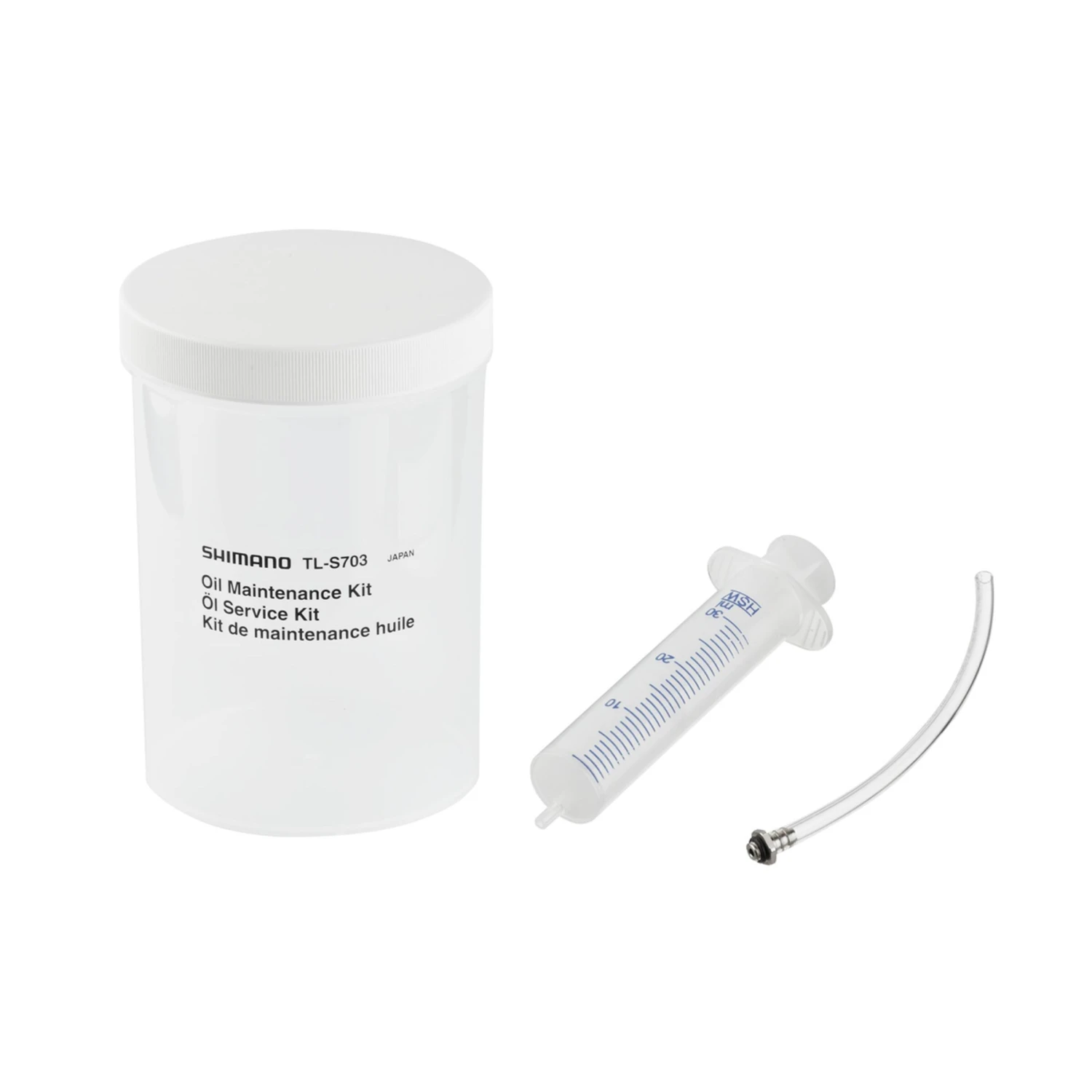 Kit de vidange pour les moyeux Alfine SG-S700 à 11 vitesses. Seringue et tuyau de raccordement pour un nettoyage simple et propre du moyeu ; le récipient permet d’entreposer l’huile utilisée.